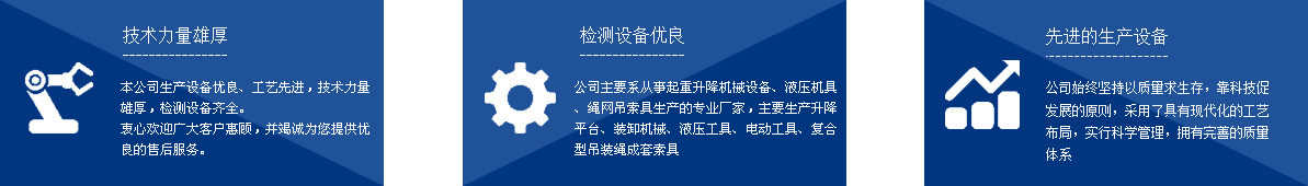 本公司系從事起重升降機(jī)械設(shè)備、液壓機(jī)具、繩網(wǎng)吊索具生產(chǎn)的專(zhuān)業(yè)廠家,主要生產(chǎn)千斤頂、液壓拉馬、軸承加熱器、升降平臺(tái)、裝卸機(jī)械、液壓工具、電動(dòng)工具、復(fù)合型吊裝繩成套索具、高強(qiáng)纖維柔性吊裝帶、起重鏈條成套索具、橫梁吊具、注塑繩、軟梯、安全帶、安全網(wǎng)等幾大系列、上百種規(guī)格的產(chǎn)品,廣泛應(yīng)用于電力、油田、大型鋼廠、機(jī)電、化工、航空、冶金、機(jī)械、鐵道、造紙、港口、建筑等領(lǐng)域。